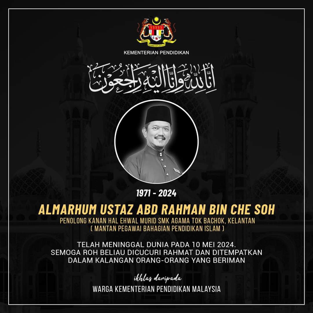 SMK Agama Tok Bachok menerima berita yang mendukacitakan pada hari ini, apabila PK HEM yang baru sahaja melaporkan diri untuk bertugas disekolah ini telah meninggal dunia. Walaupun kehadiran beliau hanya sekejap, tetapi meninggalkan banyak kesan yang baik buat semua warga sekolah. Semoga roh Allahyarham diberi rahmat dan keampunan disisi Allah